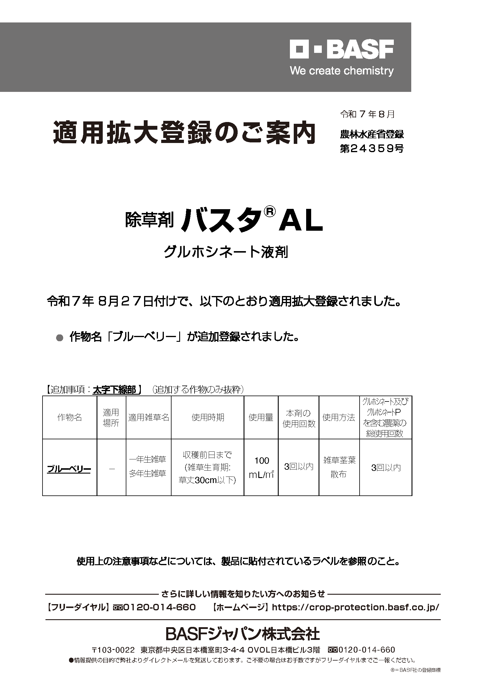【除草剤】 第24359号 バスタ®AL: 添付PDFのとおり