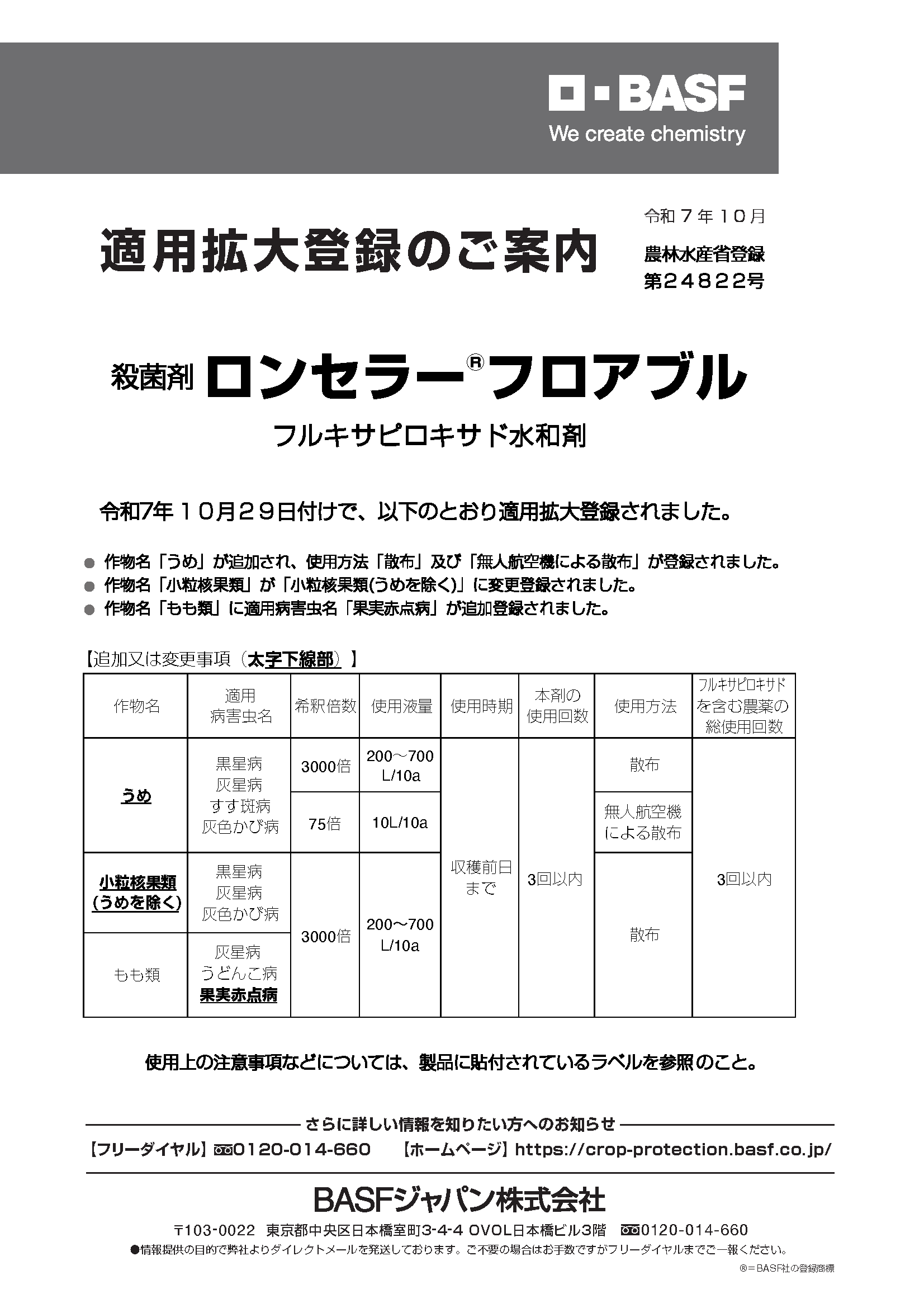 【殺菌剤】登録番号21987号 ストロビーフロアブル :使用液量変更(アスパラガス/100-300L→100-500L/10a)、りんどう:使用液量変更(100-400L→100-700L/10a)