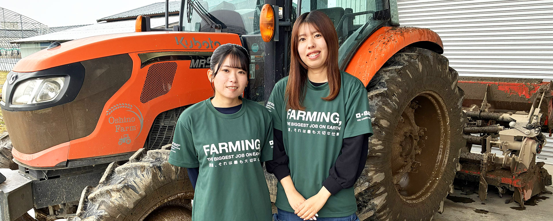 A. おしの農場は三代続く農家です。妹(寧々さん)は親の農業の手伝いをするのが楽しく、小学生の頃から「将来は農業経営者になろう」と決めていました。私(姉の日菜子さん)は妹が家業を継ぐのであればと思い、普通高校に進学しました。高校卒業する前に改めて進路を考え、保育園やスーパーなどでインターンシップも経験してみたのですが、あんまりピンとくるものがありませんでした。そんな中、昔から妹と一緒に親の手伝いをしてきた農業のことを思い返し、「やはり農業はやっていて面白い」と感じるようになりました。そこで、農業を本格的に学んでみようと決意し、農業大学校への進学を経て就農しました。現在は、水稲105ha、大豆20haを栽培しています。